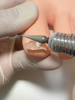 爪の厚みを整え補正具の密着を高めるために削ります。 -